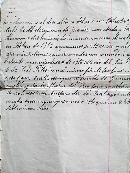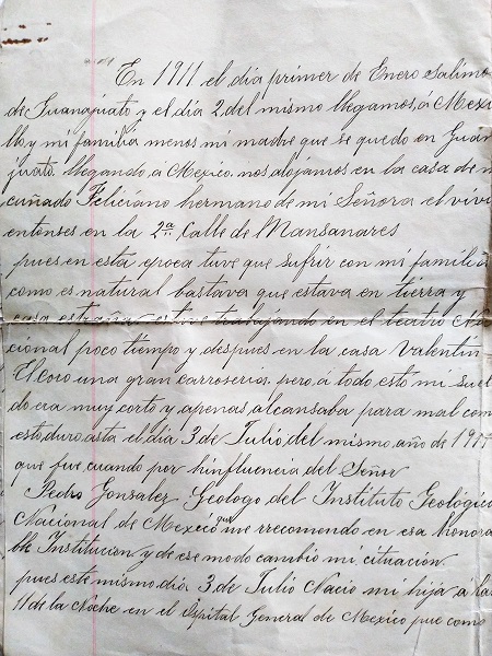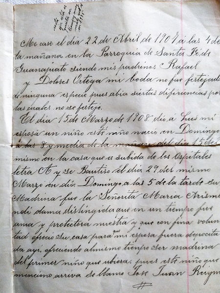Me case el día 22 de Abril de 1907 a las 4 de la mañana en la Parroquia de Santa Fé de Guanajuato siendo mis padrinos Rafael y Dolores Ortega mi boda no fue festejada de ninguna especie pues abia siertas difiriencias por las cuales no se festejó.