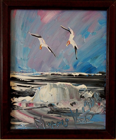 [Painting] by the Polish-American artist Morris Katz: Seascape and seagulls. Aceite sobre masonita, marco de madera. Oil on masonite, wooden frame.